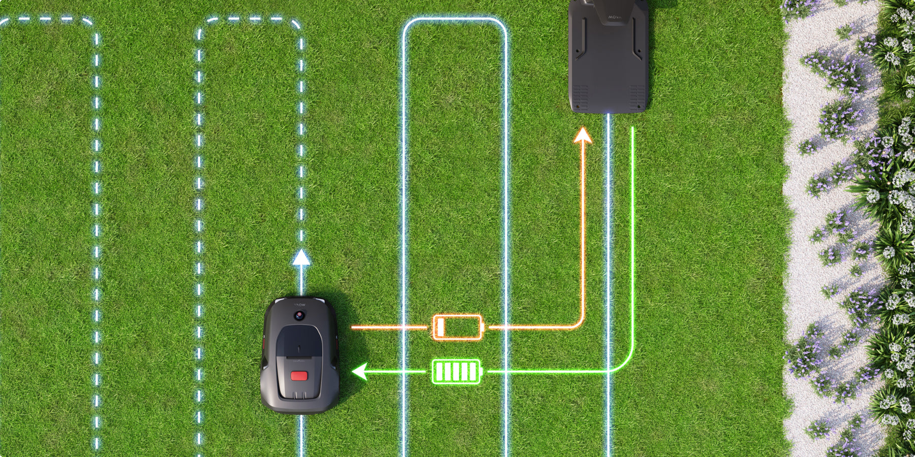 Experience uninterrupted lawn care: When the battery drops below 15%, MOVA 1000/600 automatically recharges and then resumes mowing.