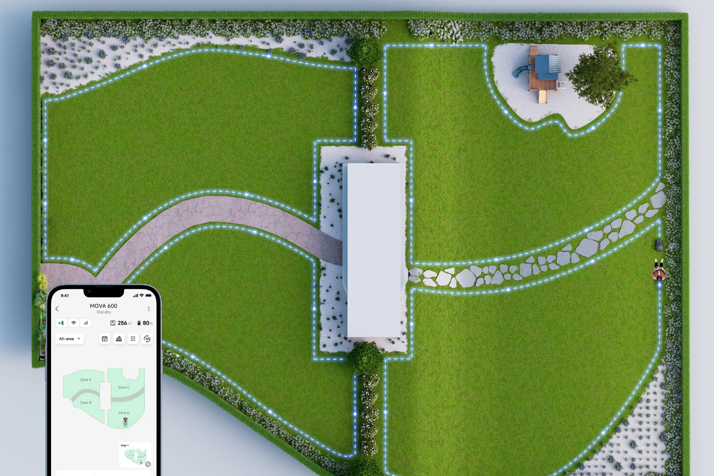 The Mova 1000/600 lets you create and manage 2 independent maps for disjointed yards, allowing you to customize distinct mowing plans for maximum efficiency.