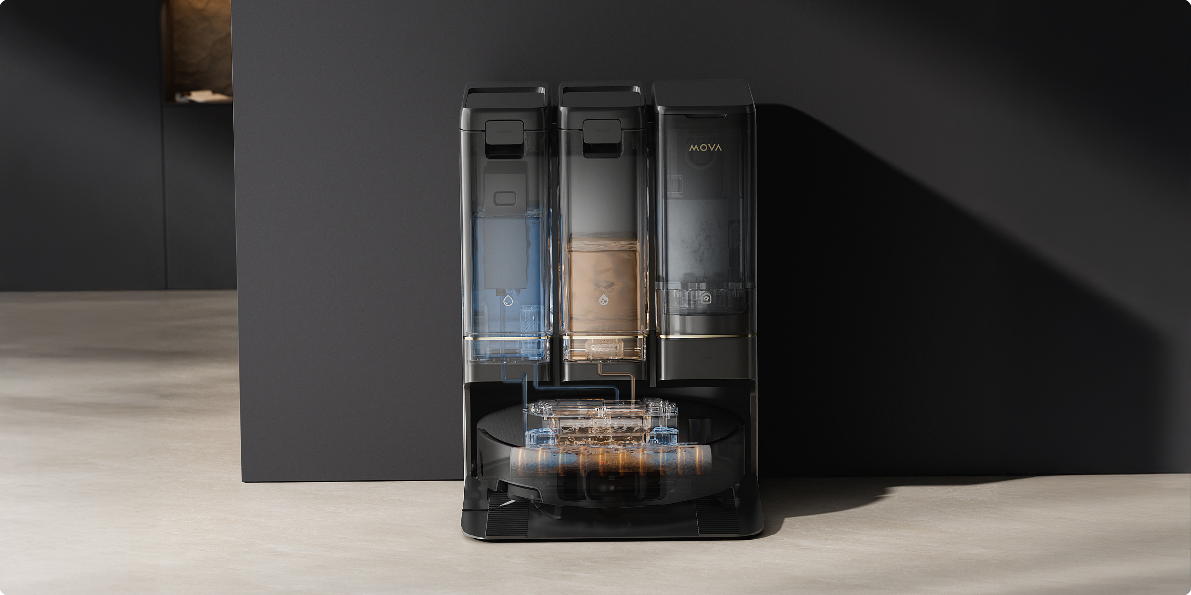 The all-in-one base station features an intuitive three-zone design. With 75°C hot water, it deeply cleans the mop, while the 4L dust box ensures up to 120 days of maintenance-free use*. Thoroughly cleaned, truly hands-free.