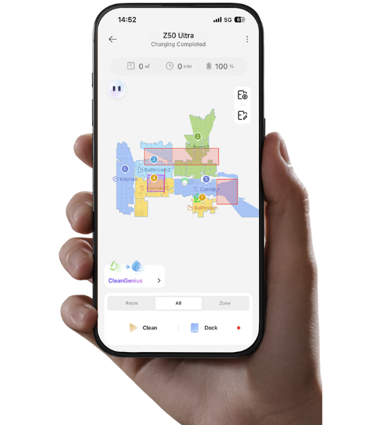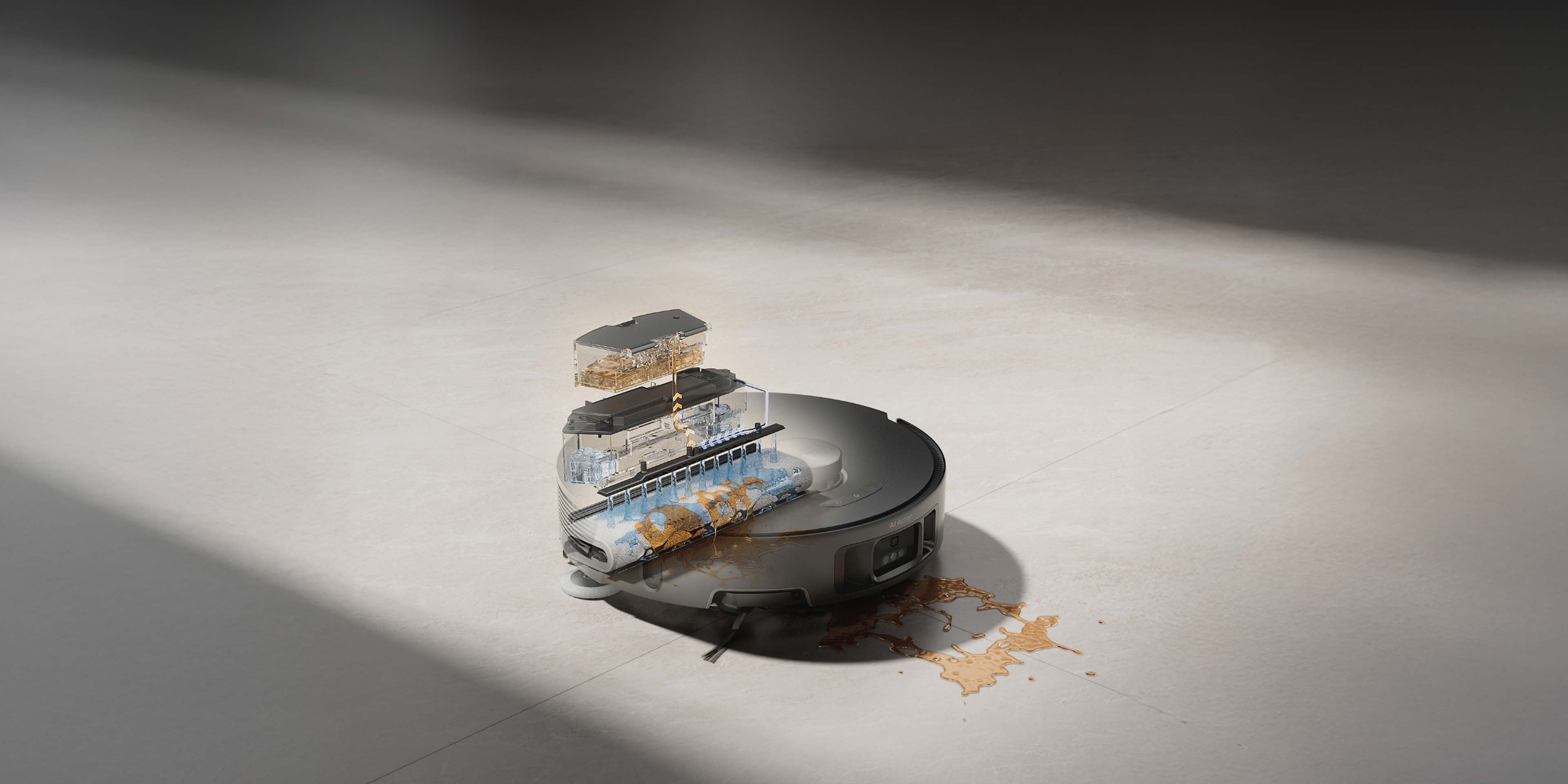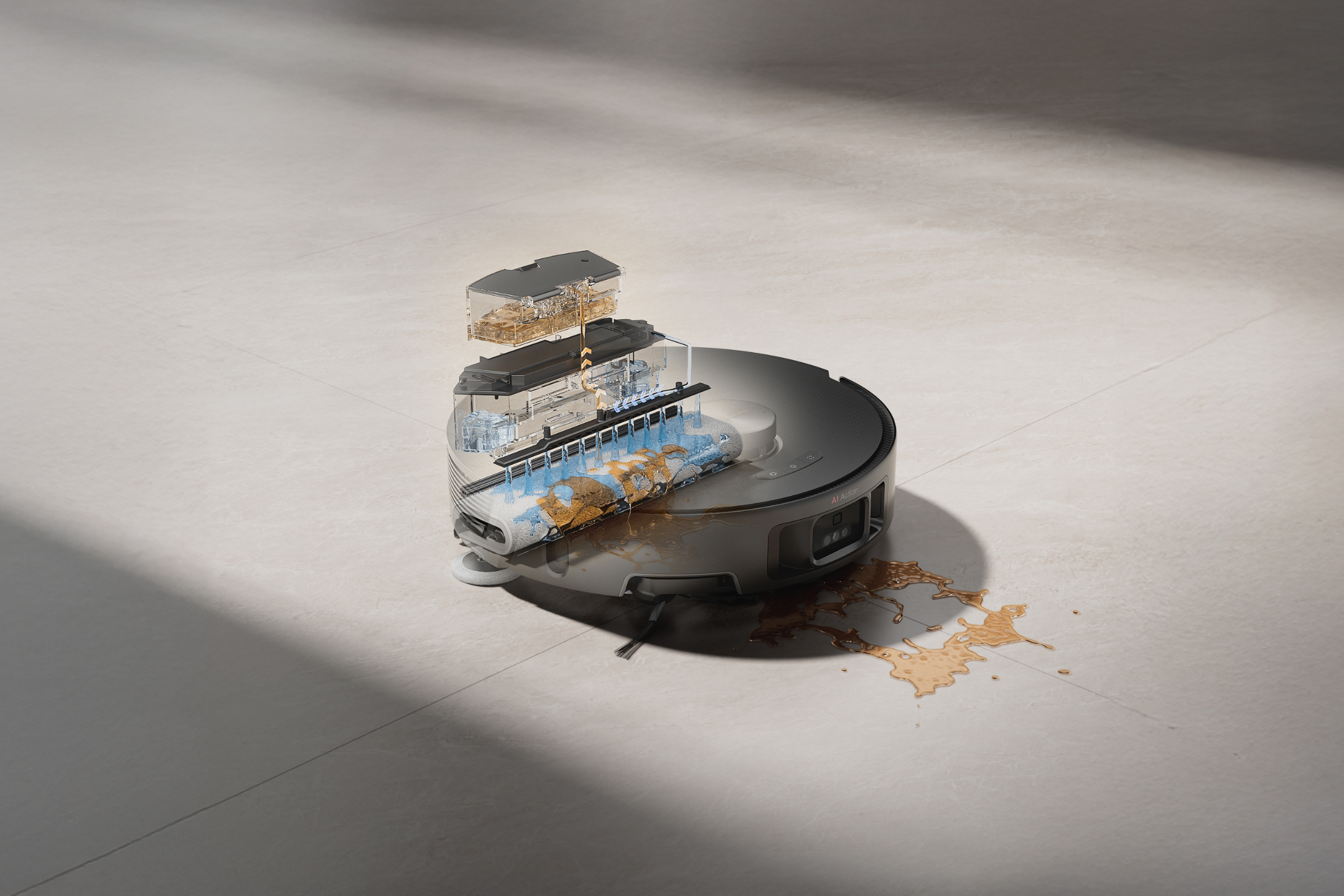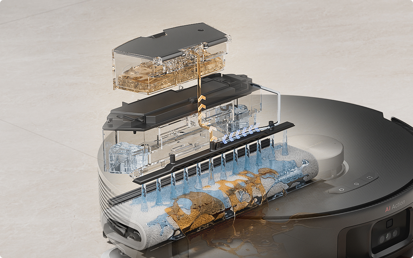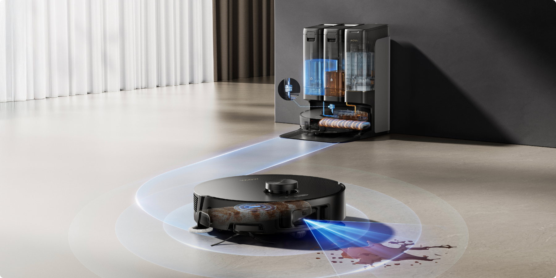 Triple-Intelligence AI Sensing Tech™:Binocular AI, Robot Vacuum AI, and Base Station AI—work together for efficient, smart cleaning, detecting dirt, dividing cleaning zones, and adjusting strategies in real time. It innovatively monitors the mop condition, re-washing it in base station when needed to prevent re-contamination and maintain high-quality cleaning.
