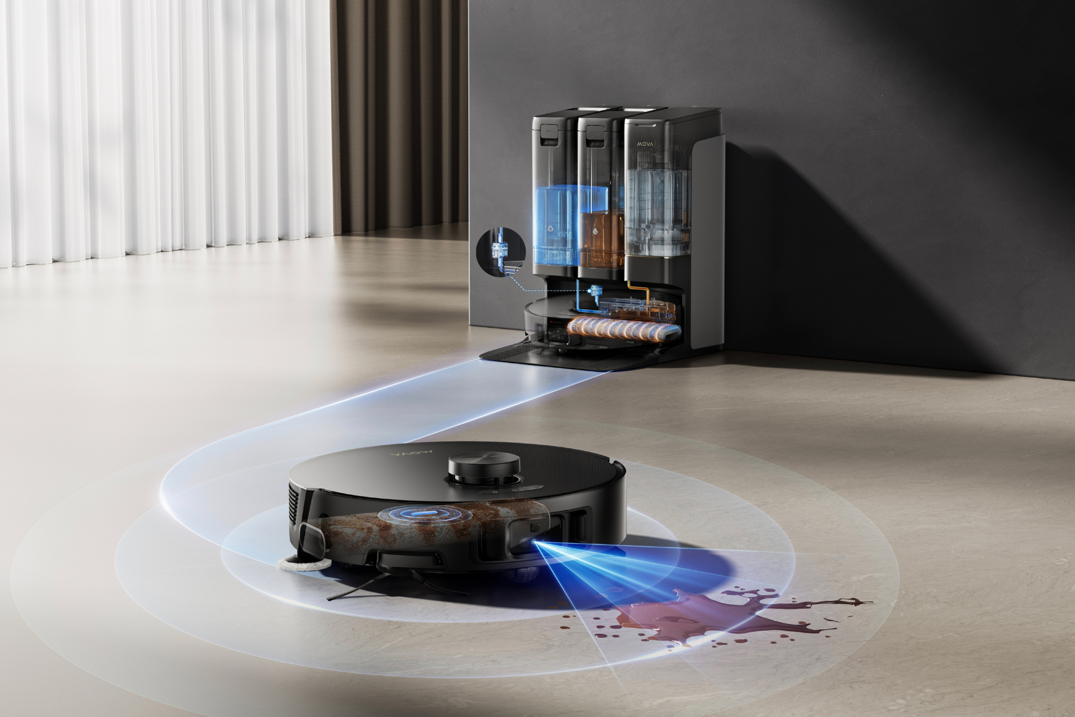 5. * "MOVA Innovation" Real-Time Multiple Dirt Detection: "MOVA Innovation" here refers to the combined use of front AI, dual RGB cameras, built-in color sensor on the mop, and multi-spectural turbidity detection in the base station for smart recognition.